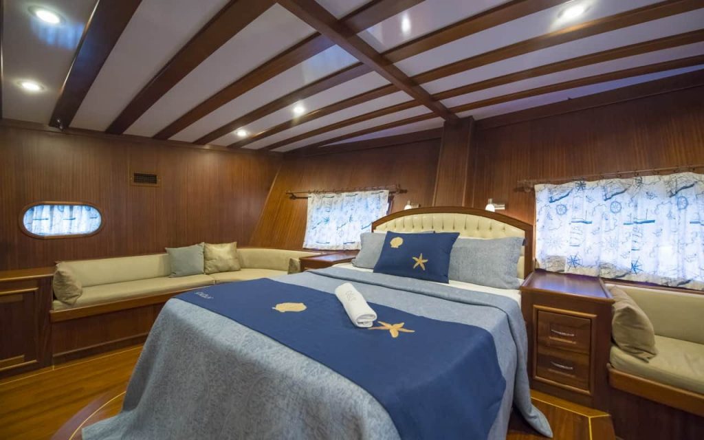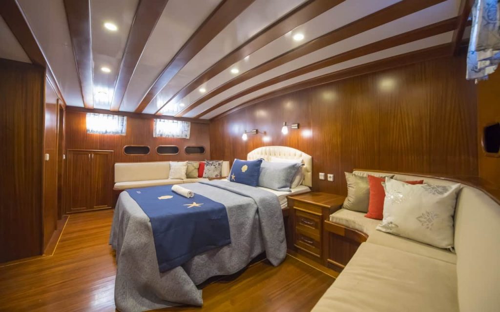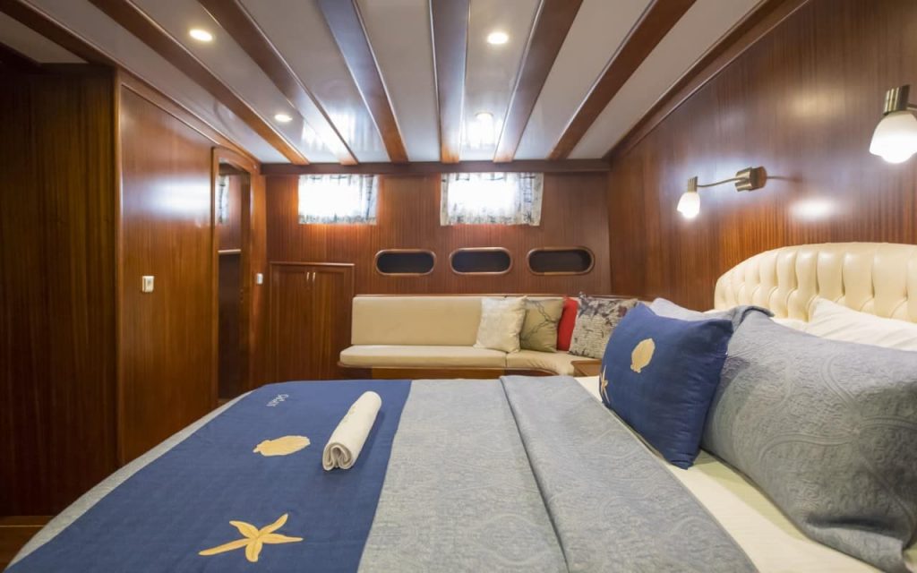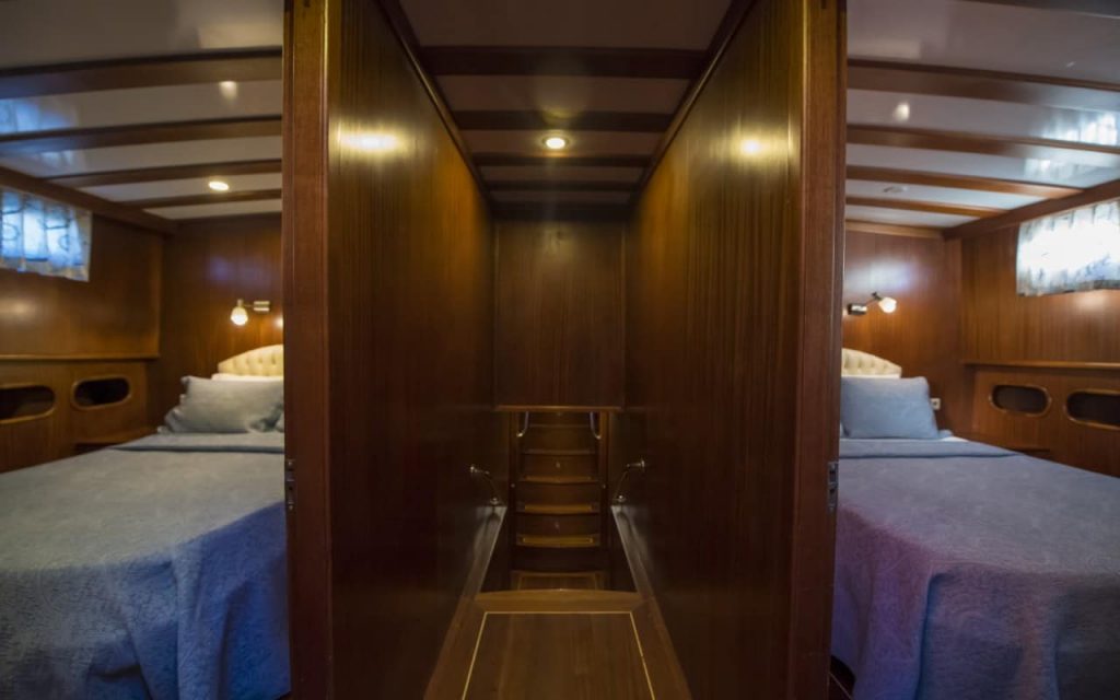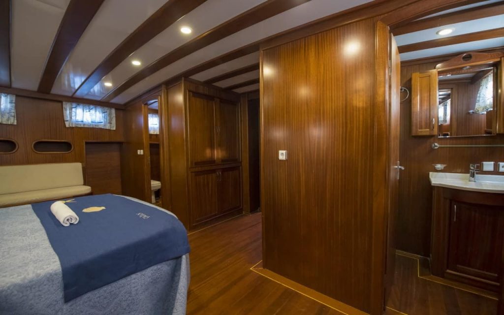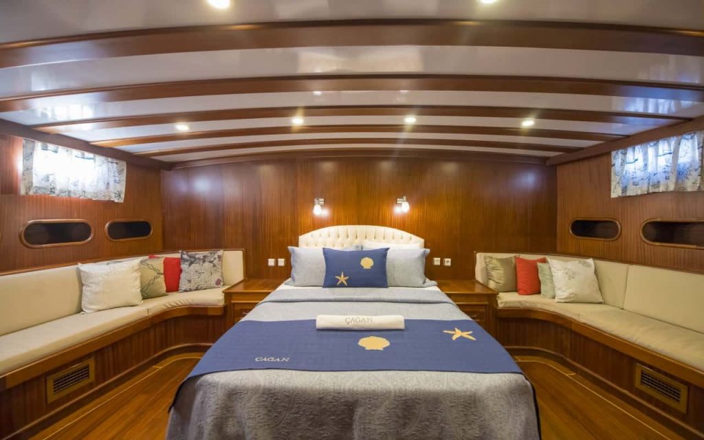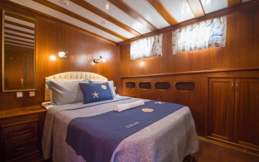 L’elegante caicco di lusso Cagan, costruito a Marmaris, ha navigato la sua prima stagione nel 2016 offrendo nuovo comfort e spazio su 31 metri con le sue cabine per sei ospiti. Una pratica disposizione delle cabine combina due grandi cabine principali a poppa e a prua che godono dello spazio del baglio, oltre a due cabine doppie con letti matrimoniali e due cabine triple che combinano un letto matrimoniale e un letto singolo. Ogni cabina ha il proprio bagno privato con doccia, lavabo e WC. Le cabine e il salone interno sono dotate di aria condizionata per il comfort degli ospiti.