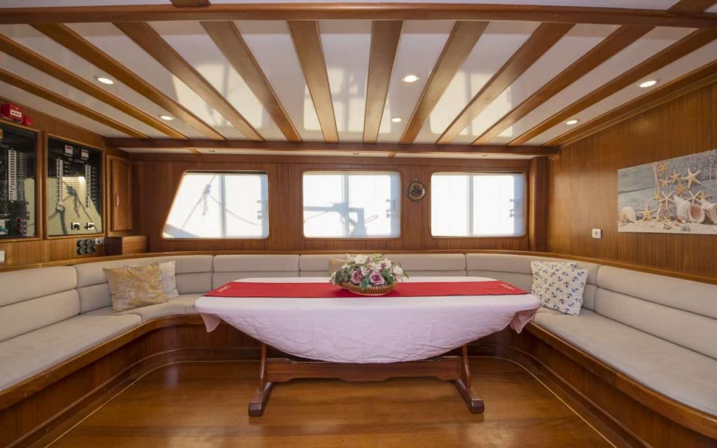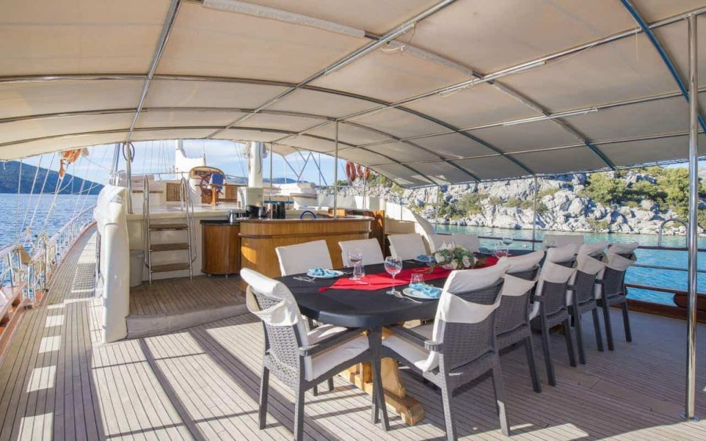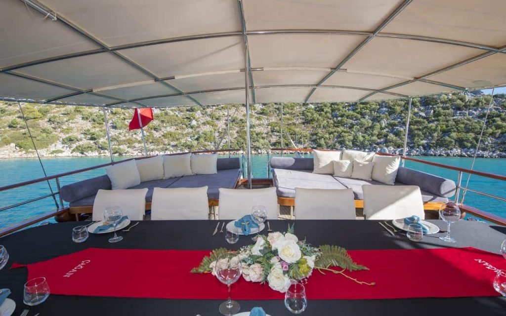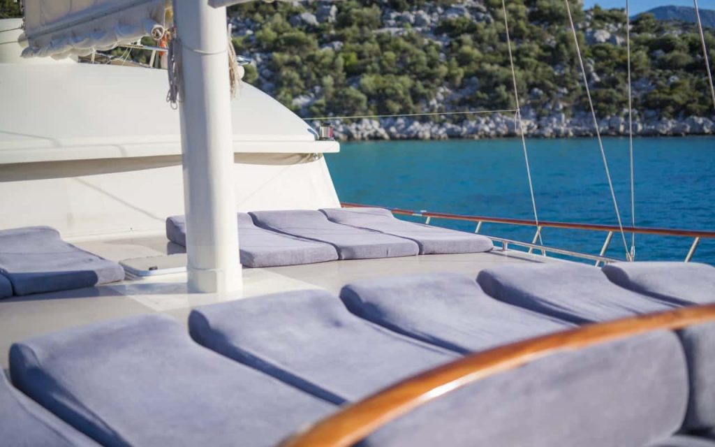 Il Cagan ha tutti i classici spazi esterni adatti per la vera vita su un caicco a noleggio, per rilassarsi e godersi il sole mentre vengono serviti pasti deliziosi, nella cura di un equipaggio professionale e amichevole. Il personale fa tutto il necessario, dalle pulizie alla navigazione da baia tranquilla a baia tranquilla, o verso un paesino marittimo. L’equipaggio conosce bene la costa e le vicine isole greche di Rodi e Symi, che possono anche essere incluse nell’itinerario con partenza da Marmaris. Trovare luoghi tranquilli o antichi siti da esplorare sulla riva regala una vacanza a galla memorabile, sul bellissimo caicco Cagan.