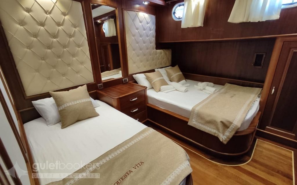 Con un totale di 6 cabine magnificamente progettate, tra cui 2 cabine master, 2 cabine doppie e 2 cabine triple, la Questa Vita può ospitare comodamente fino a 12 ospiti. Ogni cabina è dotata di controllo climatico per garantire un soggiorno confortevole, indipendentemente dalle condizioni meteorologiche. Gli interni si distinguono per l’atmosfera sofisticata e accogliente, riflettendo la perfetta fusione di lusso e funzionalità.