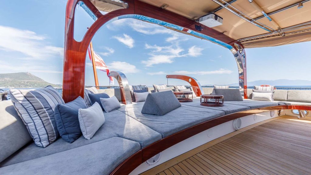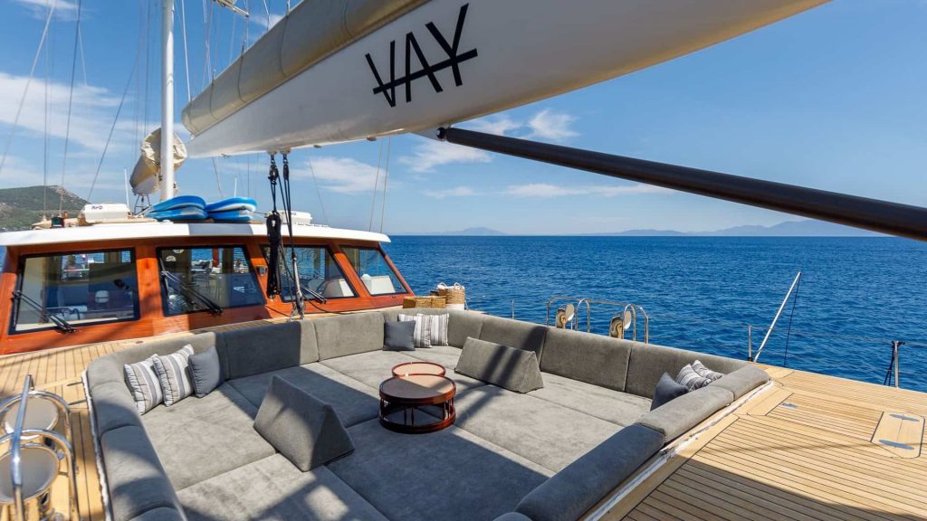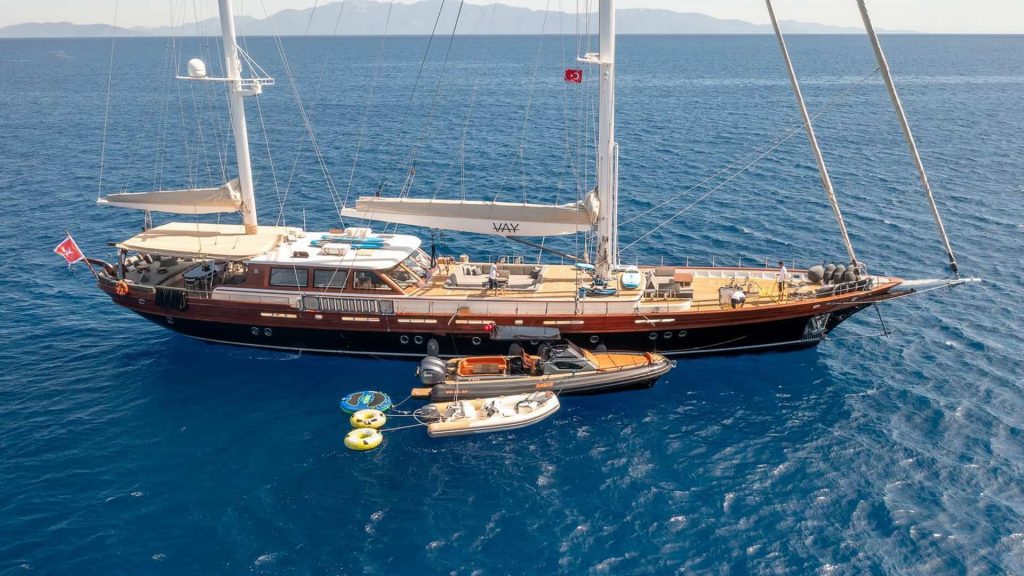 Per quanto riguarda le specifiche tecniche, il caicco Vay è alimentato da due motori principali Scania da 385 hp ciascuno, assicurando una navigazione fluida e potente. Lo yacht è completamente climatizzato, offrendo un ambiente confortevole in ogni condizione atmosferica. Un equipaggio professionale composto da sei membri è dedicato a garantire un servizio impeccabile e a rendere ogni soggiorno a bordo un’esperienza memorabile.