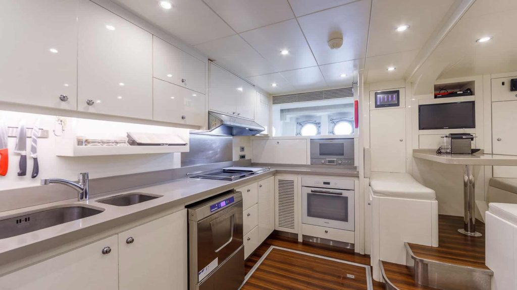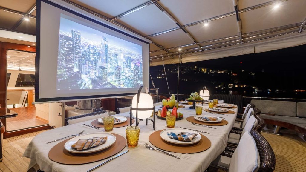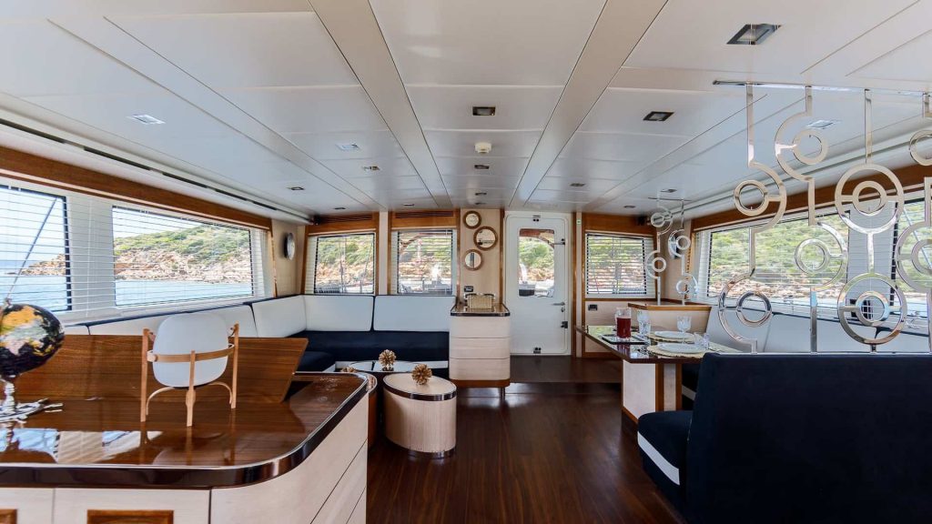L’esterno dello yacht presenta una spaziosa area ponte, ideale per rilassarsi e godersi le viste panoramiche delle isole greche. La confortevole area salotto offre uno spazio perfetto per socializzare con gli altri ospiti a bordo.