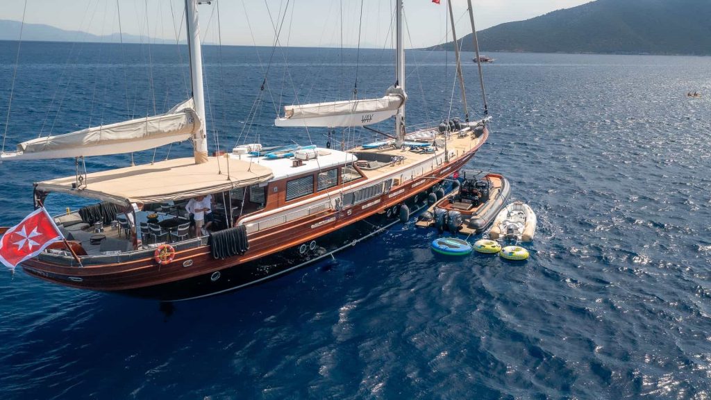 Il VIP caicco Vay è dotato di una vasta gamma di attrezzature per sport acquatici, ideali per arricchire la vostra avventura in mare. Gli ospiti possono divertirsi con due ringos, due Yamaha seabobs, due tavole da paddle, un wakeboard, uno sci nautico per adulti e uno per bambini. Inoltre, è disponibile un dinghy Yamaha da 70 hp per facilitare l’accesso a terra e per attività acquatiche aggiuntive.